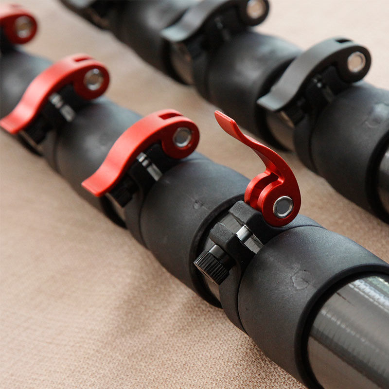 لوله های تلسکوپی قوی و سبک با رول فیبر کربن با کلیمپ های سریع. یک قطب فیبر کربن 12 متری با وزن 2.4 کیلوگرم (قطب ها و کلیمپ ها شامل) ،و قطب ها را می توان تا یک طول کوتاه بسته شد، که معمولا کمتر از 2.5 متر برای حمل و نقل آسان و ذخیره سازی است.